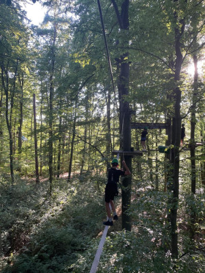 Dann ging es endlich los: 2,5 Stunden freies Klettern über die verschiedenen Parcours warteten auf die Teilnehmenden. Die Routen boten alles – von leichten Strecken in Bodennähe bis hin zu luftigen Passagen in schwindelerregender Höhe. Besonders beliebt waren die Seilrutschen, die mit viel Tempo durch den Wald führten, und die wackeligen Hängebrücken, die Geschick und Gleichgewicht erforderten. Wer Mut hatte, wagte sich auch an anspruchsvollere Elemente wie die Kletterwände zwischen den Bäumen oder den freien Sprung ins Netz.